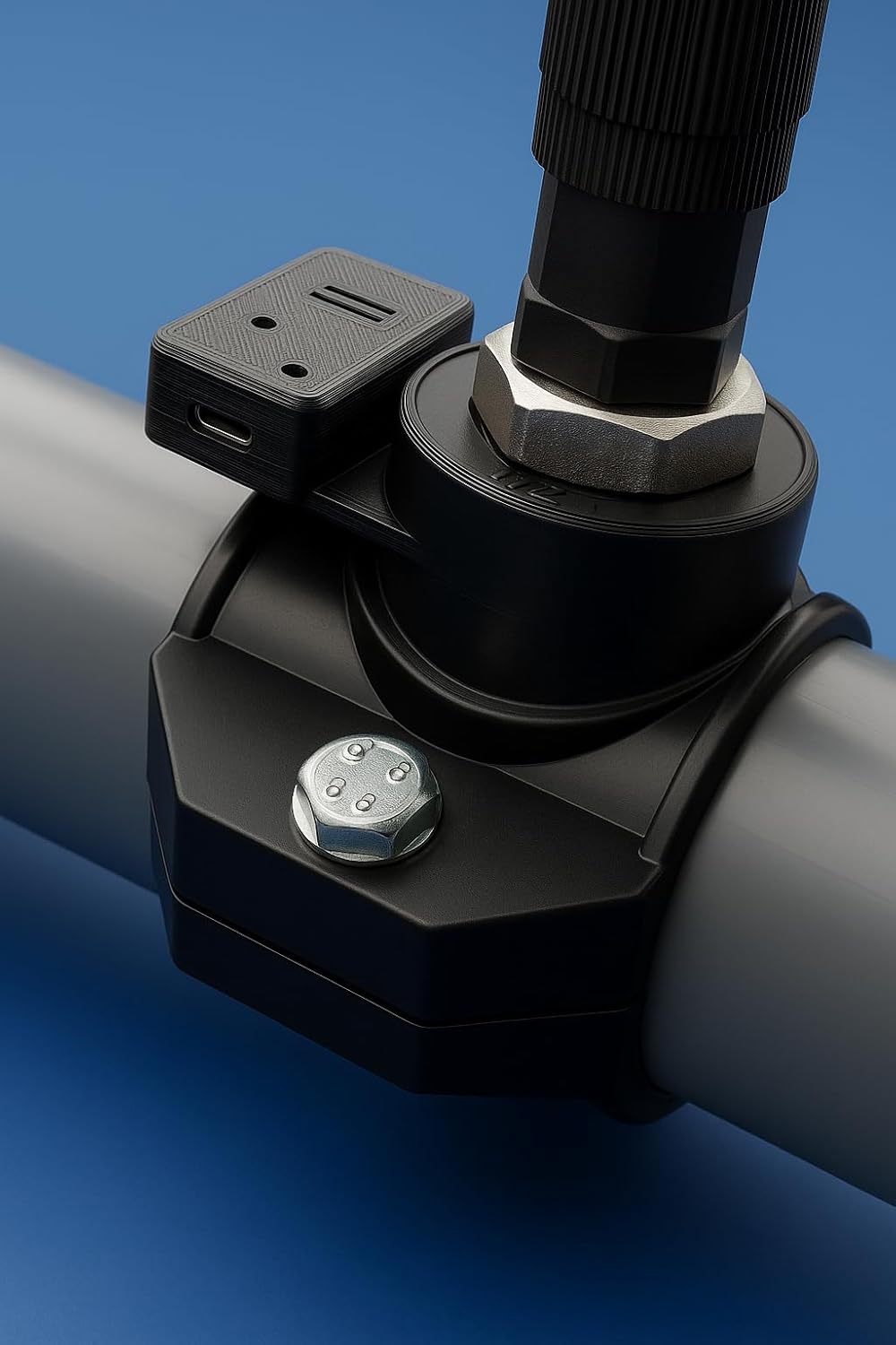 Für die Montage ist lediglich ein 8 mm Loch im Rohr zu bohren, in das der Sensor anschließend sicher eingeführt und mit der Klemme fixiert wird.
